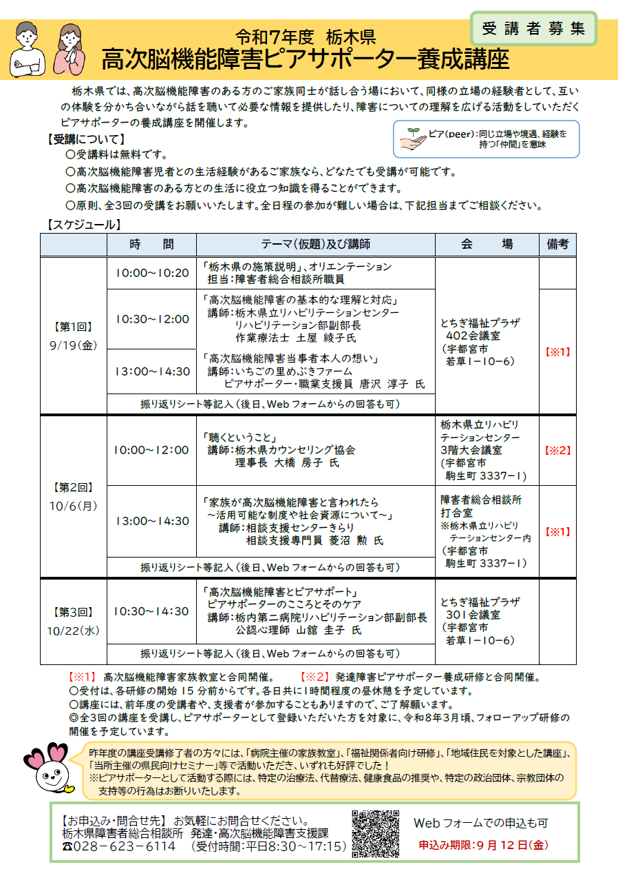 その他 | 講座により、「高次脳機能障害家族教室」や「発達障害ピアサポーター養成講座」と合同開催 |